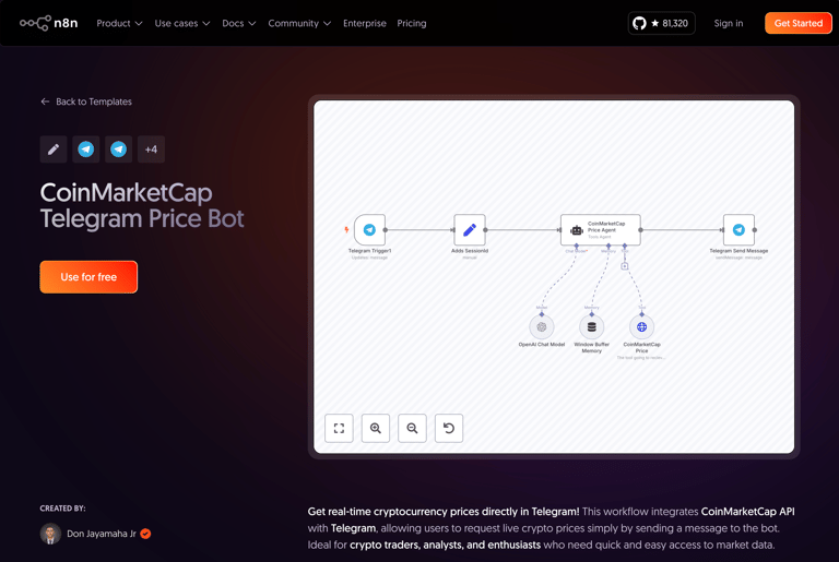 Track real-time cryptocurrency prices directly in Telegram! This workflow connects with the CoinMarketCap API to deliver up-to-the-minute price updates, market caps, volume data, and rankings for any listed token. Ideal for traders, investors, and crypto enthusiasts who want to stay informed on market movements without leaving their chat app. Fast, simple, and essential for any on-the-go market watcher.