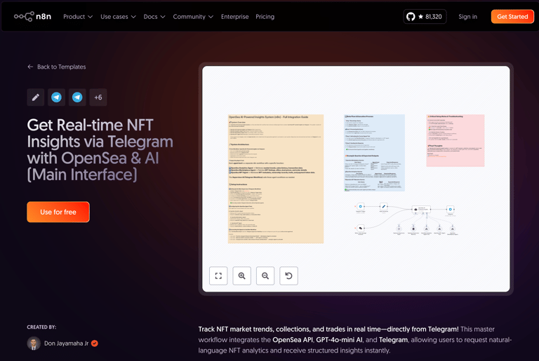Instantly access NFT market data through Telegram! This workflow integrates the OpenSea API with AI-powered summarization to deliver real-time insights on NFT collections, floor prices, listing activity, and volume trends. Ideal for NFT collectors, traders, and digital art enthusiasts who want quick, intelligent updates without leaving their messaging app.